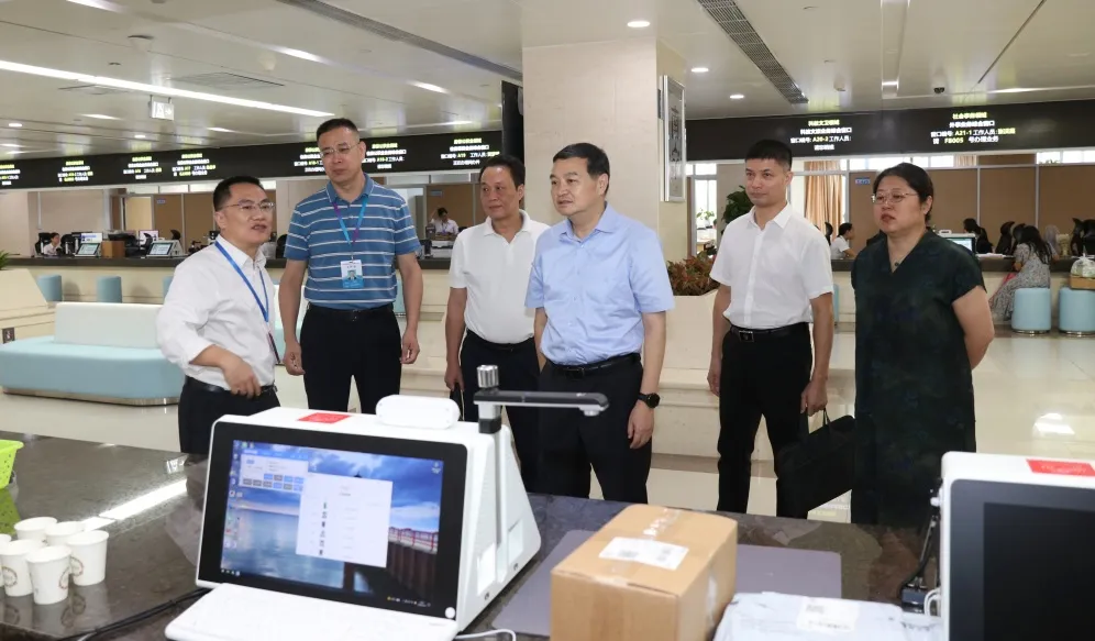 李勇强实地查看迁入新址窗口人员工作状态、精神面貌,了解业务办理、工作环境情况,听取工作意见和建议。对政务服务窗口在优化政务服务、提升行政效能方面所取得的成绩给予肯定。